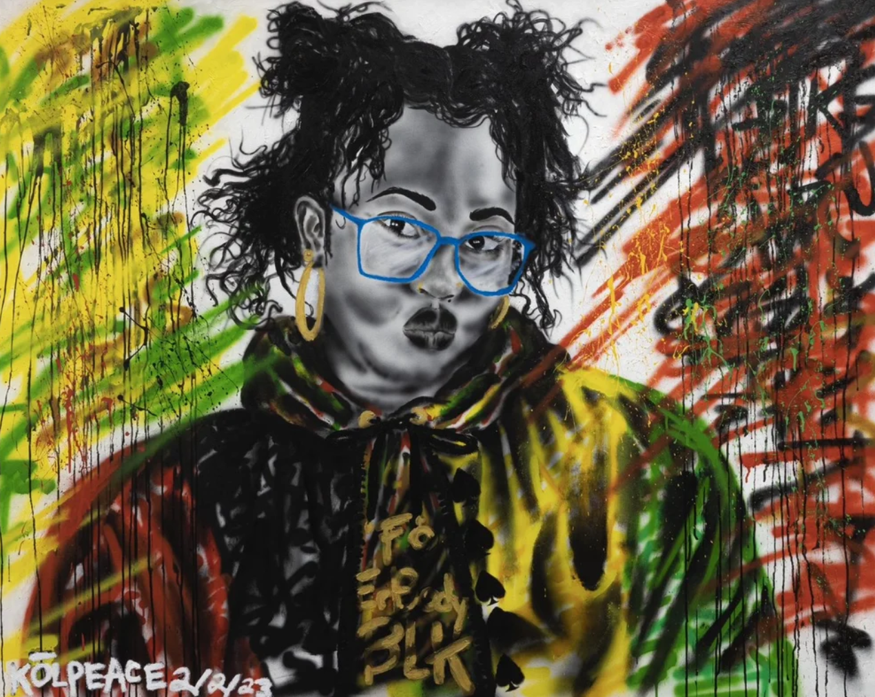 Artist Christopher “kolpeace” Johnson explores his black southern culture & ancestral characters through liberating portraits while rapidly creating & specializing in contemporary art, public art, community art, and performance art. His work is intended to instigate the narrative of taking the art off the gallery walls and to the people by engagement mixing graffiti techniques with contemporary art tools. “kolpeace” (which stands for Kids Only Love Peace) presents a black identified folktale that paints from his influential past/present/future, in hopes to create moments of betterment towards humanity. He uses childhood genres of his black cultural folk life (such as trill, trap, and soul music) to encourage and liberate cultural prejudice.